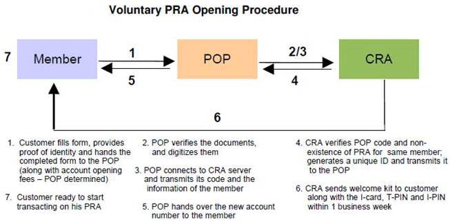 This PRA will stay with the member regardless of where he stays or works - including spells of unemployment, self-employment , change in job or location. The member will be able to use Pension Service Providers (POPs) to access this system for opening a PRA, accreting new contributions, receiving accounts or system information and for obtaining retirement benefits.